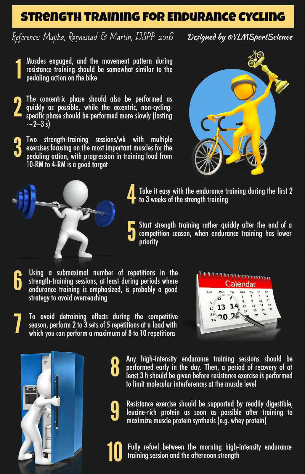 Despite early and ongoing debate among athletes, coaches, and sport scientists, it is likely that resistance training for endurance cyclists can be tolerated, promotes desired adaptations that support training, and can directly improve performance. Lower-body heavy strength training performed in addition to endurance-cycling training can improve both short- and long-term endurance performance. Strength-maintenance training is essential to retain strength gains during the competition season. Competitive female cyclists with greater lower-body lean mass (LBLM) tend to have ~4-9% higher maximum mean power per kg LBLM over 1 s to 10 min. Such relationships enable optimal body composition to be modeled. Resistance training off the bike may be particularly useful for modifying LBLM, whereas more cycling-specific training strategies like eccentric cycling and single-leg cycling with a counterweight have not been thoughtfully investigated in well-trained cyclists. Potential mechanisms for improved endurance include postponed activation of less efficient type II muscle fibers, conversion of type IIX fibers into more fatigue-resistant IIa fibers, and increased muscle mass and rate of force development.