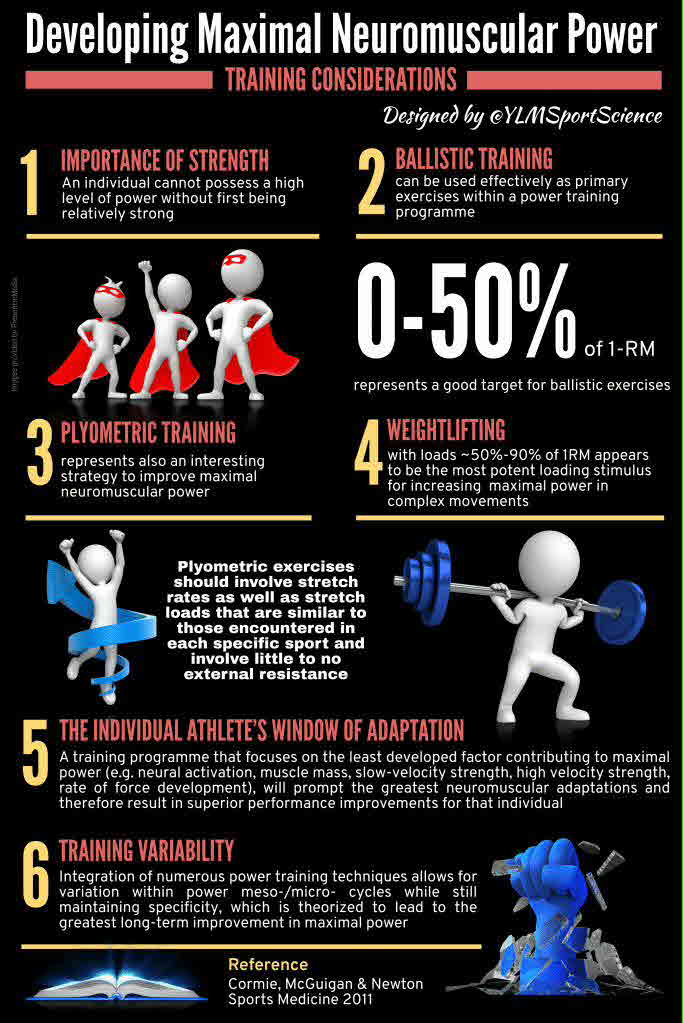 This series of reviews focuses on the most important neuromuscular function in many sport performances: the ability to generate maximal muscular power. Part 1, published in an earlier issue of Sports Medicine, focused on the factors that affect maximal power production while part 2 explores the practical application of these findings by reviewing the scientific literature relevant to the development of training programmes that most effectively enhance maximal power production. The ability to generate maximal power during complex motor skills is of paramount importance to successful athletic performance across many sports. A crucial issue faced by scientists and coaches is the development of effective and efficient training programmes that improve maximal power production in dynamic, multi-joint movements. Such training is referred to as 'power training' for the purposes of this review. Although further research is required in order to gain a deeper understanding of the optimal training techniques for maximizing power in complex, sports-specific movements and the precise mechanisms underlying adaptation, several key conclusions can be drawn from this review. First, a fundamental relationship exists between strength and power, which dictates that an individual cannot possess a high level of power without first being relatively strong. Thus, enhancing and maintaining maximal strength is essential when considering the long-term development of power. Second, consideration of movement pattern, load and velocity specificity is essential when designing power training programmes. Ballistic, plyometric and weightlifting exercises can be used effectively as primary exercises within a power training programme that enhances maximal power. The loads applied to these exercises will depend on the specific requirements of each particular sport and the type of movement being trained. The use of ballistic exercises with loads ranging from 0% to 50% of one-repetition maximum (1RM) and/or weightlifting exercises performed with loads ranging from 50% to 90% of 1RM appears to be the most potent loading stimulus for improving maximal power in complex movements. Furthermore, plyometric exercises should involve stretch rates as well as stretch loads that are similar to those encountered in each specific sport and involve little to no external resistance. These loading conditions allow for superior transfer to performance because they require similar movement velocities to those typically encountered in sport. Third, it is vital to consider the individual athlete's window of adaptation (i.e. the magnitude of potential for improvement) for each neuromuscular factor contributing to maximal power production when developing an effective and efficient power training programme. A training programme that focuses on the least developed factor contributing to maximal power will prompt the greatest neuromuscular adaptations and therefore result in superior performance improvements for that individual. Finally, a key consideration for the long-term development of an athlete's maximal power production capacity is the need for an integration of numerous power training techniques. This integration allows for variation within power meso-/micro-cycles while still maintaining specificity, which is theorized to lead to the greatest long-term improvement in maximal power.