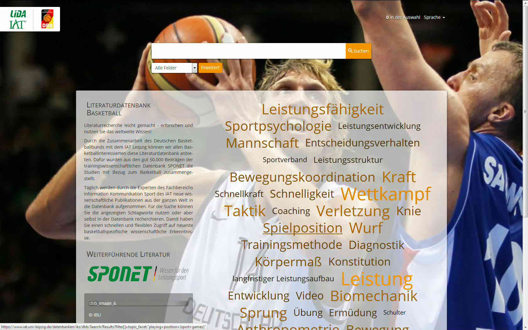 Durch die Zusammenarbeit des Deutschen Basketballbunds mit dem IAT Leipzig können wir allen Basketballinteressierten diese Literaturdatenbank anbieten. Dafür wurden aus den gut 50.000 Beiträgen der trainingswissenschaftlichen Datenbank SPONET die Studien mit Bezug zum Basketball zusammengestellt.