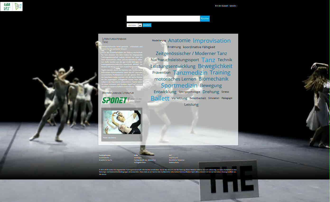 Durch die Zusammenarbeit der Palucca Hochschule für Tanz Dresden mit dem Institut für Angewandte Trainingswissenschaft Leipzig können wir allen am Tanz Interessierten diese Literaturdatenbank anbieten. Dafür wurden aus den gut 53.000 Beiträgen der trainingswissenschaftlichen Datenbank SPONET die Studien mit Bezug zum Tanz zusammengestellt.