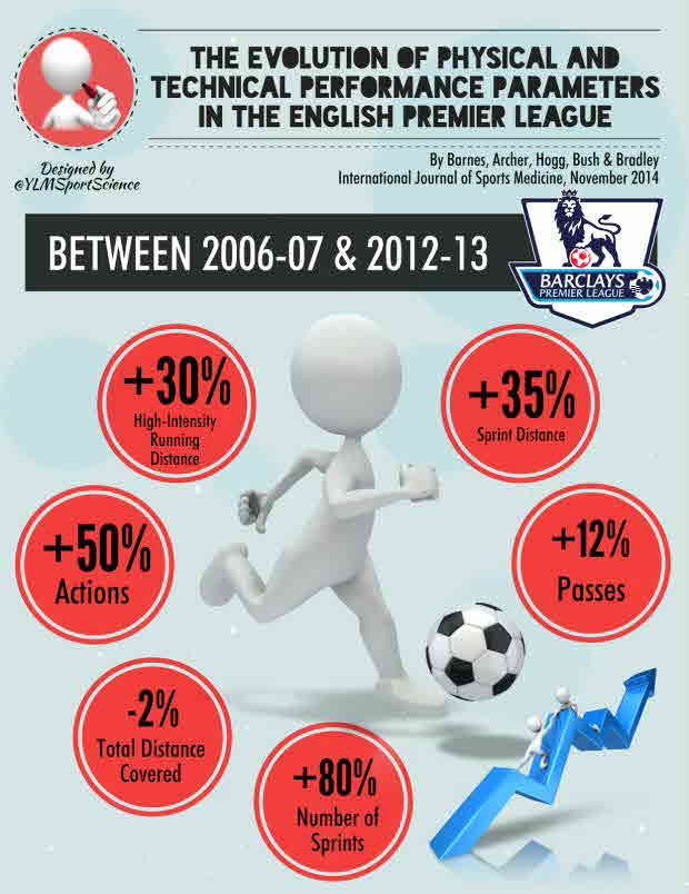 This study examined the evolution of physical and technical soccer performance across a 7-season period in the English Premier League. Match performance observations (n=14 700) were analysed for emergent trends. Total distance covered during a match was ~2% lower in 2006-07 compared to 2012-13. Across 7 seasons, high-intensity running distance and actions increased by ~30% (890±299 vs. 1 151±337 m, p<0.001; ES: 0.82) and ~50% (118±36 vs. 176±46, p<0.001; ES: 1.41), respectively. Sprint distance and number of sprints increased by ~35% (232±114 vs. 350±139 m, p<0.001; ES: 0.93) and ~85% (31±14 vs. 57±20, p<0.001; ES: 1.46), respectively. Mean sprint distance was shorter in 2012-13 compared to 2006-07 (5.9±0.8 vs. 6.9±1.3 m, p<0.001; ES: 0.91), with the proportion of explosive sprints increasing (34±11 vs. 47±9%, p<0.001; ES: 1.31). Players performed more passes (35±17 vs. 25±13, p<0.001; ES: 0.66) and successful passes (83±10% vs. 76±13%, p<0.001; ES: 0.60) in 2012-13 compared to 2006-07. Whereas the number of short and medium passes increased across time (p<0.001; ES>0.6), the number of long passes varied little (p<0.001; ES: 0.11). This data demonstrates evolution of physical and technical parameters in the English Premier League, and could be used to aid talent identification, training and conditioning preparation.