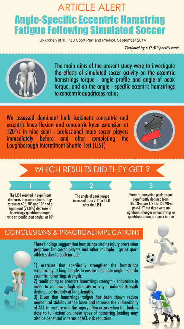 Purpose: To evaluate the effect of simulated soccer on the hamstrings eccentric torque-angle profile and angle of peak torque (APTeccH), and on the hamstrings:quadriceps torque ratio at specific joint angles (ASHecc:Qcon). Methods: The authors assessed dominant-limb isokinetic concentric and eccentric knee flexion and concentric knee extension at 120°/s in 9 semiprofessional male soccer players immediately before and after they completed the Loughborough Intermittent Shuttle Test (LIST). Results: The LIST resulted in significant decreases in eccentric hamstrings torque at 60°, 50°, and 10° and a significant (21.8%) decrease in ASHecc:Qcon at 10° (P < .05). APTeccH increased from 7.1° ± 1.0° to 18.8° ± 4.2° (P < .05). Eccentric hamstrings peak torque significantly declined from 185.1 ± 70.4 N·m pre-LIST to 150.9 ± 58.5 N·m post-LIST (P = .002), but there were no significant changes in hamstrings or quadriceps concentric peak torque (P = .312, .169, respectively). Conclusions: Simulated soccer results in a selective loss of eccentric hamstrings torque and hamstrings-to-quadriceps muscle balance at an extended joint position and a shift in the eccentric hamstrings APT to a shorter length, changes that could increase vulnerability to hamstrings injury. These findings suggest that injury-risk screening could be improved by evaluating the eccentric hamstrings torque-angle profile and hamstrings strength-endurance and that the development of hamstrings fatigue resistance and long-length eccentric strength may reduce injury incidence.