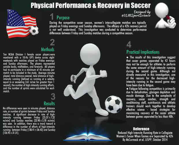 Purpose: During the competitive soccer season, women`s intercollegiate matches are typically played on Friday evenings and Sunday afternoons. The efficacy of a 42-h recovery period is not well understood. This investigation was conducted to determine performance differences between Friday and Sunday matches during a competitive season. Methods: Ten NCAA Division I female soccer players (20.5 ± 1.0 y, 166.6 ± 5.1 cm, 61.1 ± 5.8 kg) were monitored with 10-Hz GPS devices across 8 weekends with matches played on Friday evenings and Sunday afternoons. The players were outside backs, midfielders, and forwards. All players had to participate in a minimum of 45 min/match to be included in the study. Average minutes played, total distance covered, total distance of high-intensity running (HIR) (defined as running at a velocity equal to or exceeding 3.61 m/s for longer than 1 s), the number of HIR efforts, and the number of sprints were calculated for each match. Data for Friday vs Sunday matches were averaged and then compared using dependent t tests. Results: No differences were seen in minutes played, distance rate, or number of sprints between Friday and Sunday matches. A significant (P = .017) decrease in rate of HIR between Friday (25.37 ± 7.22 m/min) and Sunday matches (22.90 ± 5.70 m/min) was seen. In addition, there was a trend toward a difference (P = .073) in the number of efforts of HIR between Friday (138.41 ± 36.43) and Sunday (126.92 ± 31.31). Conclusions: NCAA Division I female soccer players cover less distance of HIR in games played less than 48 h after another game. This could be due to various factors such as dehydration, glycogen depletion, or muscle damage.