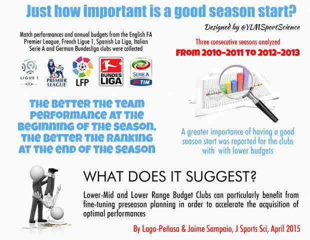 The aim of the current study was (i) to identify how important is a good season start on elite soccer teams` performance and (ii) to examine whether this impact is related to the clubs` financial budget. The match performances and annual budgets of all teams were collected from the English FA Premier League, French Ligue 1, Spanish La Liga, Italian Serie A and German Bundesliga for three consecutive seasons (2010-2011 to 2012-2013). A k-means cluster analysis classified the clubs according to their budget as High Range Budget Clubs, Upper-Mid Range Budget Clubs, Lower-Mid Range Budget Clubs and Low Range Budget Clubs. Data were examined through linear regression models. Overall, the results suggested that the better the team performance at the beginning of the season, the better the ranking at the end of the season. However, the impact of the effect depended on the clubs` annual budget, with lower budgets being associated with a greater importance of having a good season start (P < 0.01). Moreover, there were differences in trends across the different leagues. These variables can be used to develop accurate models to estimate final rankings. Conversely, Lower-Mid and Lower Range Budget Clubs can benefit from fine-tuning preseason planning in order to accelerate the acquisition of optimal performances.