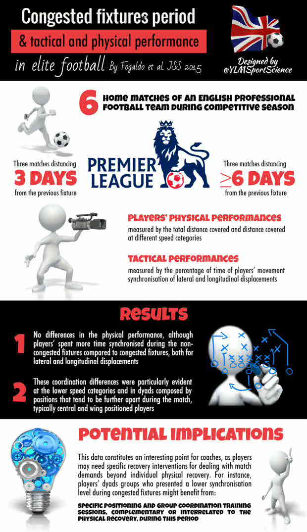 The aim of this study was to examine the physical and tactical performances of a professional football team under congested and non-congested fixture periods. Six home matches of an English professional football team were analysed during competitive season (3 matches distancing three days from the previous fixture and 3 matches distancing six or more days from the previous fixture). Players` physical performances were measured by the total distance covered and distance covered at different speed categories. Tactical performances were measured by the percentage of time of players` movement synchronisation of lateral and longitudinal displacements. This variable was calculated considering all the possible pairs of outfield players, for the overall match and at different speed categories. Results showed no differences in the physical performance, although players` spent more time synchronised during the non-congested fixtures compared to congested fixtures, both for lateral (41.26% to 38.51%, ES: -0.3, P < 0.001) and longitudinal displacements (77.22% to 74.48%, ES: -0.5, P < 0.001). These coordination differences were particularly evident at the lower speed categories and in dyads composed by positions that tend to be further apart during the match, typically central and wing positioned players. Tactical performance seems to be affected by fixtures distribution, with players` spending more time synchronised during the non-congested fixtures. As players` cover the same amount of distance at similar intensities in both fixtures distribution, this reduction of synchronisation may be associated with an increased perception of fatigue and consequent adaptation strategies.