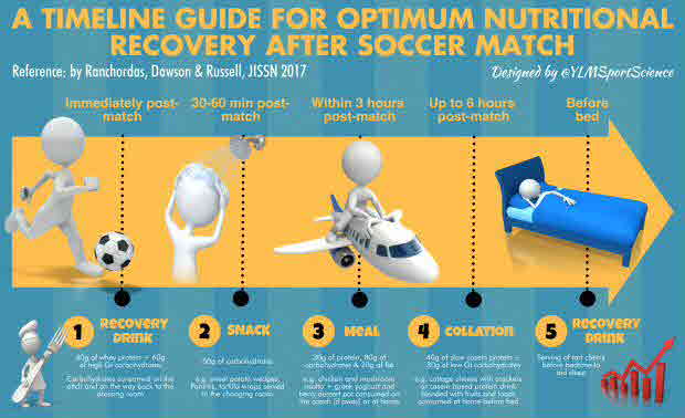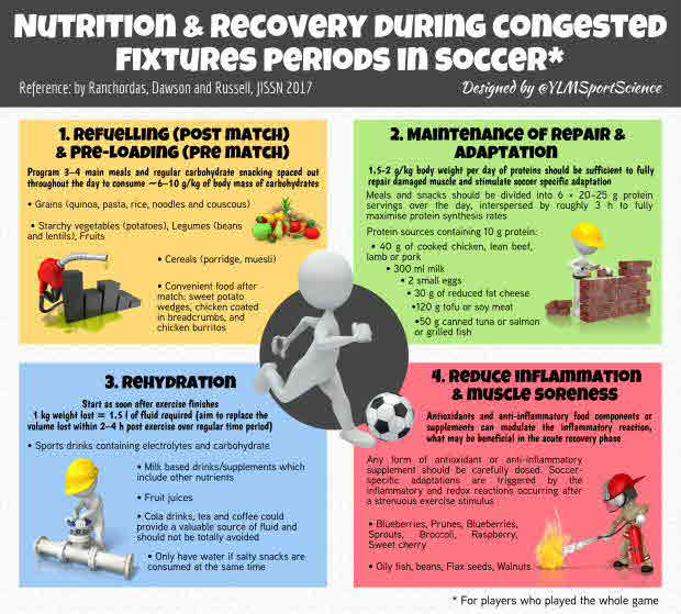 Specific guidelines that aim to facilitate the recovery of soccer players from the demands of training and a congested fixture schedule are lacking; especially in relation to evidence-based nutritional recommendations. The importance of repeated high level performance and injury avoidance while addressing the challenges of fixture scheduling, travel to away venues, and training commitments requires a strategic and practically feasible method of implementing specific nutritional strategies. Here we present evidence-based guidelines regarding nutritional recovery strategies within the context of soccer. An emphasis is placed on providing practically applicable guidelines for facilitation of recovery when multiple matches are played within a short period of time (i.e. 48 h). Following match-play, the restoration of liver and muscle glycogen stores (via consumption of ~1.2 g·kg-1·h-1 of carbohydrate) and augmentation of protein synthesis (via ~40 g of protein) should be prioritised in the first 20 min of recovery. Daily intakes of 6-10 g·kg-1 body mass of carbohydrate are recommended when limited time separates repeated matches while daily protein intakes of >1.5 g·kg-1 body mass should be targeted; possibly in the form of multiple smaller feedings (e.g., 6 × 20-40 g). At least 150% of the body mass lost during exercise should be consumed within 1 h and electrolytes added such that fluid losses are ameliorated. Strategic use of protein, leucine, creatine, polyphenols and omega-3 supplements could also offer practical means of enhancing post-match recovery. Abstract from author