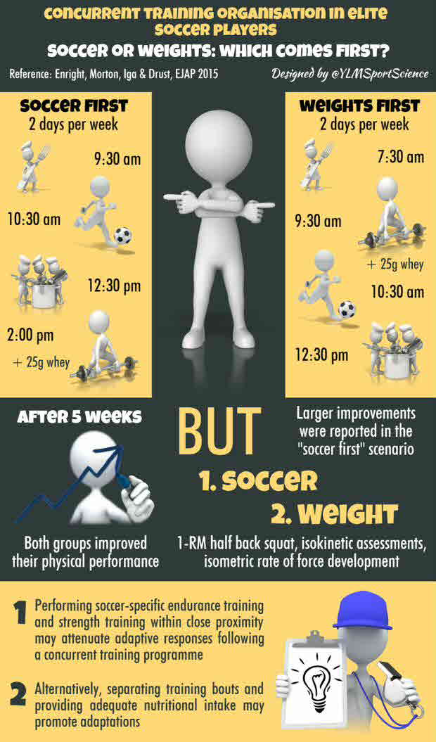 Results suggest the organisation of concurrent training, recovery time allocated between training bouts and the availability nutrition may be able to modulate small but clinically significant changes in physical performance parameters associated with match-play. This may have practical implications for practitioners who prescribe same day concurrent training protocols.