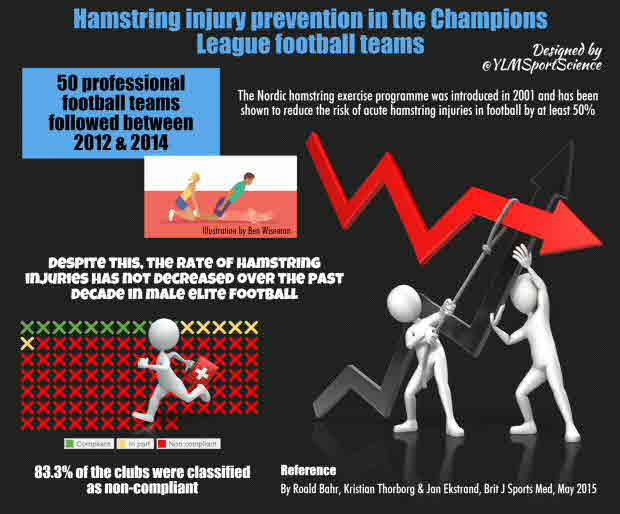 Background The Nordic hamstring (NH) exercise programme was introduced in 2001 and has been shown to reduce the risk of acute hamstring injuries in football by at least 50%. Despite this, the rate of hamstring injuries has not decreased over the past decade in male elite football. Aim To examine the implementation of the NH exercise programme at the highest level of male football in Europe, the UEFA Champions League (UCL), and to compare this to the Norwegian Premier League, Tippeligaen, where the pioneer research on the NH programme was conducted. Design Retrospective survey. Setting/participants 50 professional football teams, 32 from the UCL and 18 from Tippeligaen. Methods A questionnaire, based on the Reach, Efficacy, Adoption, Implementation and Maintenance framework, addressing key issues related to the implementation of the NH programme during three seasons from 2012 through 2014, was distributed to team medical staff using electronic survey software. Results The response rate was 100%. Of the 150 club-seasons covered by the study, the NH programme was completed in full in 16 (10.7%) and in part in an additional 9 (6%) seasons. Consequently, 125 (83.3%) club-seasons were classified as non-compliant. There was no difference in compliance between the UCL and Tippeligaen in any season (2: 0.41 to 0.52). Conclusions Adoption and implementation of the NH exercise programme at the highest levels of male football in Europe is low; too low to expect any overall effect on acute hamstring injury rates.