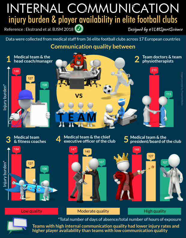 Objectives: We investigated medical staff interpretations and descriptions of internal communication quality in elite football teams to determine whether internal communication was correlated with injuries and/or player availability at training and matches. Methods: Medical staff from 36 elite football clubs across 17 European countries produced 77 reports at four postseason meetings to provide their perceptions of internal communications in their teams. They also recorded data on individual players` exposure to football and time-loss injuries. Results: The injury burden and incidence of severe injuries were significantly higher in teams with low quality of communication between the head coach/manager and the medical team (scores of 1-2 on a 5-point Likert scale) compared with teams with moderate or high-quality scores (scores of 3-5; p=0.008 for both). Teams with low scores had 4%-5% lower training attendance (76% vs 83%, p=0.001) and less availability at matches (82% vs 88%, p=0.004) compared with teams with moderate or high communication quality scores. Conclusions: The quality of internal communication within a team was correlated with injury rates, training attendance and match availability. Abstract from author