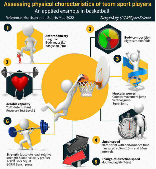 Conclusions: Physical characteristics reported indicate a wide range of abilities are present across playing competitions. The tests and outcome variables reported in the literature highlight the multitude of tests currently being used. Because there are no accepted international standards for physical assessment of basketball players, establishing normative data is challenging. Therefore, future testing should involve repeatable protocols that are standardised and provide outcomes that can be monitored across time. Recommendations for testing batteries in adult male basketball players are provided so improved interpretation of data can occur.