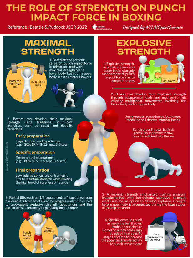 The ability to punch with a high impact force is beneficial to boxers as there is an increased likelihood of success. Punch impact force differentiates between performance level, weight class, gender, and punch type in competitive boxers. Although technique is likely to play a major role in punch impact force, the capabilities of the neuromuscular system may also be a limiting factor. This review examines the role of strength on punch impact force in amateur and professional boxers. The maximal strength qualities of the lower body, as well as explosive strength qualities of both the upper and lower body, are largely associated with punch impact force in elite amateur boxers. Specifically, elite amateur boxers who punch with "high" impact forces have greater levels of lower-body maximal strength and explosive strength when compared with elite amateurs who punch with "low" impact forces. However, the maximal strength capabilities of the upper body are not associated with punch impact force and does not differentiate between elite boxers who punch with "high" and "low" impact forces. Therefore, based off the present evidence, this review recommends that for boxers who aim to develop their punch impact force, it may be advantageous to emphasize both maximal and explosive strength development of the legs, with only an explosive strength focus in the upper body. However, it is important to highlight that, to date, there are a lack of experimental studies in both elite amateur and professional boxing. Furthermore, there is a dearth of research in female boxing. Future experimental studies are needed to infer causality regarding the role that strength training has on punch impact force in both elite amateur and professional boxers.