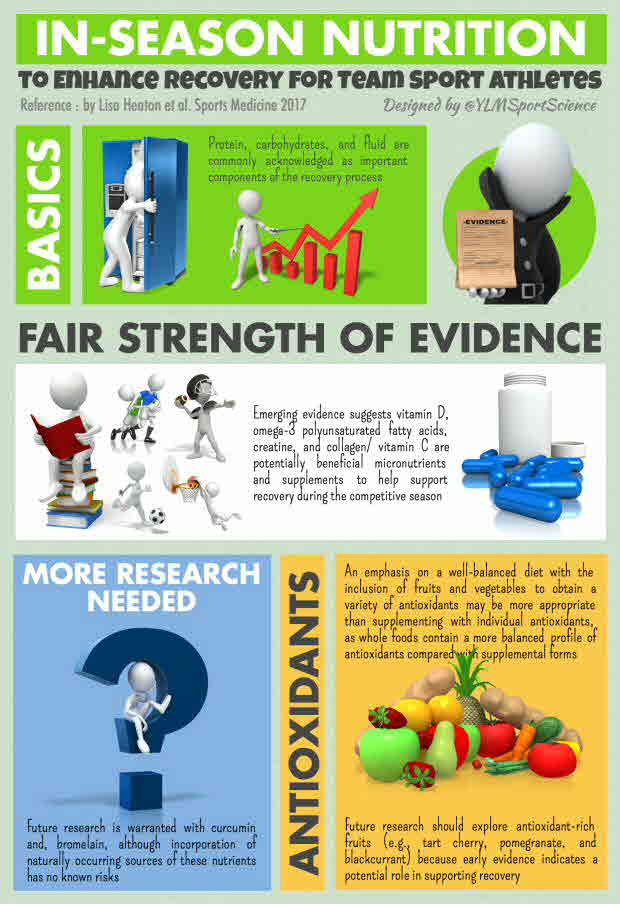 Team sport athletes face a variety of nutritional challenges related to recovery during the competitive season. The purpose of this article is to review nutrition strategies related to muscle regeneration, glycogen restoration, fatigue, physical and immune health, and preparation for subsequent training bouts and competitions. Given the limited opportunities to recover between training bouts and games throughout the competitive season, athletes must be deliberate in their recovery strategy. Foundational components of recovery related to protein, carbohydrates, and fluid have been extensively reviewed and accepted. Micronutrients and supplements that may be efficacious for promoting recovery include vitamin D, omega-3 polyunsaturated fatty acids, creatine, collagen/vitamin C, and antioxidants. Curcumin and bromelain may also provide a recovery benefit during the competitive season but future research is warranted prior to incorporating supplemental dosages into the athlete`s diet. Air travel poses nutritional challenges related to nutrient timing and quality. Incorporating strategies to consume efficacious micronutrients and ingredients is necessary to support athlete recovery in season.
