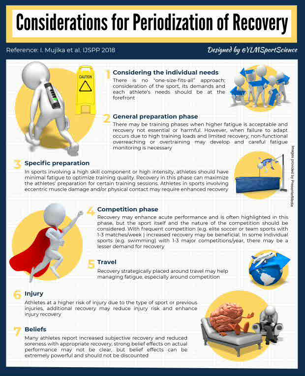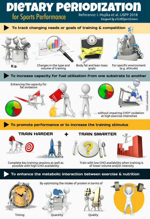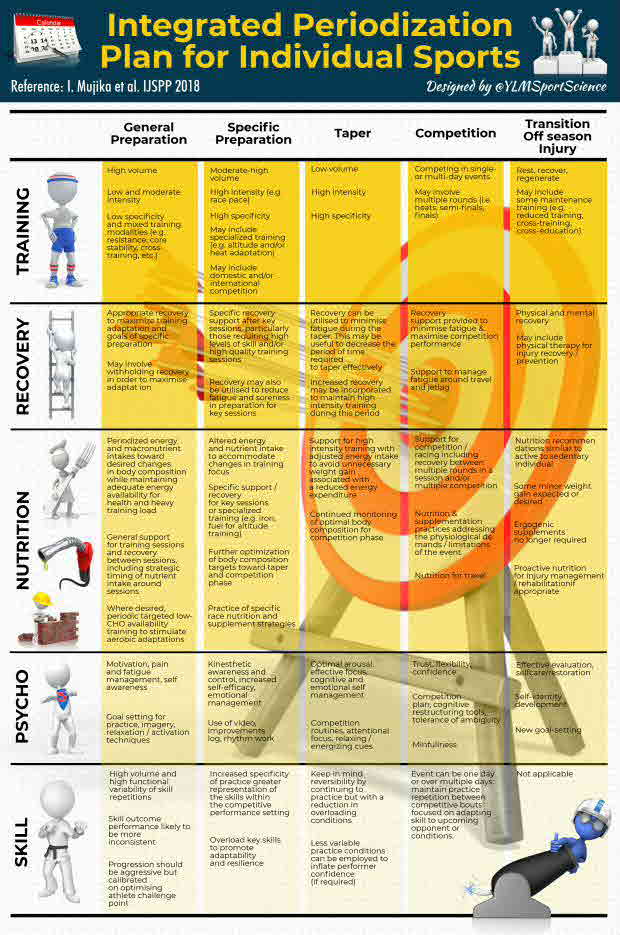 Sports periodization has traditionally focused on the exercise aspect of athletic preparation, while neglecting the integration of other elements that can impact an athlete`s readiness for peak competition performances. Integrated periodization allows the coordinated inclusion of multiple training components best suited for a given training phase into an athlete`s program. The aim of this article is to review the available evidence underpinning integrated periodization, focusing on exercise training, recovery, nutrition, psychological skills, and skill acquisition as key factors by which athletic preparation can be periodized. The periodization of heat and altitude adaptation, body composition, and physical therapy is also considered. Despite recent criticism, various methods of exercise training periodization can contribute to performance enhancement in a variety of elite individual and team sports, such as soccer. In the latter, both physical and strategic periodization are useful tools for managing the heavy travel schedule, fatigue, and injuries that occur throughout a competitive season. Recovery interventions should be periodized (ie, withheld or emphasized) to influence acute and chronic training adaptation and performance. Nutrient intake and timing in relation to exercise and as part of the periodization of an athlete`s training and competition calendar can also promote physiological adaptations and performance capacity. Psychological skills are a central component of athletic performance, and their periodization should cater to each athlete`s individual needs and the needs of the team. Skill acquisition can also be integrated into an athlete`s periodized training program to make a significant contribution to competition performance.