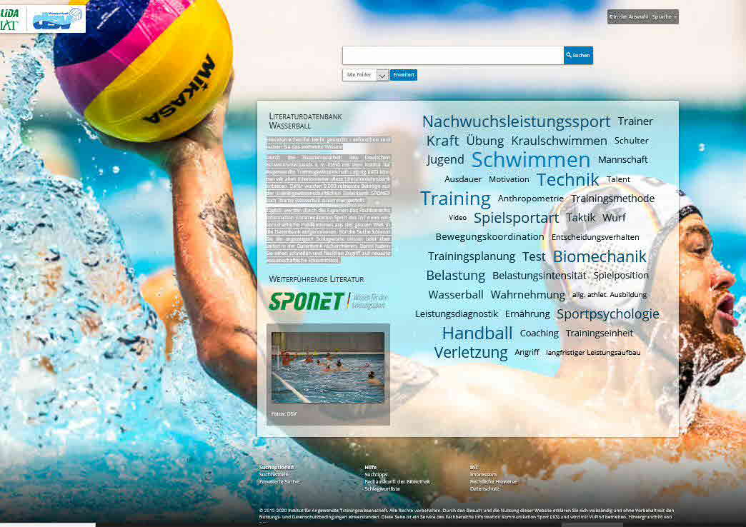 Durch die Zusammenarbeit des Deutschen Schwimm-Verbands e. V. (DSV) mit dem Institut für Angewandte Trainingswissenschaft Leipzig (IAT) können wir allen Interessierten diese Literaturdatenbank anbieten. Dafür wurden alle relevanten Beiträge aus der trainingswissenschaftlichen Datenbank SPONET zum Thema Wasserball zusammengestellt.