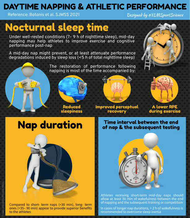Mid-day napping has been recommended as a countermeasure against sleep debt and an effective method for recovery, regardless of nocturnal sleep duration. Herein, we summarize the available evidence regarding the influence of napping on exercise and cognitive performance as well as the effects of napping on athletes` perceptual responses prior to or during exercise. The existing studies investigating the influence of napping on athletic performance have revealed equivocal results. Prevailing findings indicate that following a normal sleep night or after a night of sleep loss, a mid-day nap may enhance or restore several exercise and cognitive performance aspects, while concomitantly provide benefits on athletes` perceptual responses. Most, but not all, findings suggest that compared to short-term naps (20-30 min), long-term ones (>35-90 min) appear to provide superior benefits to the athletes. The underlying mechanisms behind athletic performance enhancement following a night of normal sleep or the restoration after a night of sleep loss are not clear yet. However, the absence of benefits or even the deterioration of performance following napping in some studies is likely the result of sleep inertia. The present review sheds light on the predisposing factors that influence the post-nap outcome, such as nocturnal sleep time, mid-day nap duration and the time elapsed between the end of napping and the subsequent testing, discusses practical solutions and stimulates further research on this area.