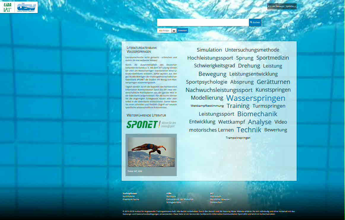 Literaturrecherche leicht gemacht - erforschen und nutzen Sie das weltweite Wissen! Durch die Zusammenarbeit des Deutschen Schwimm-Verbands e. V. mit dem IAT Leipzig können wir allen am Wasserspringen Interessierten diese Literaturdatenbank anbieten. Dafür wurden aus den gut 50.000 Beiträgen der trainingswissenschaftlichen Datenbank SPONET die Studien mit Bezug zum Wasserspringen zusammengestellt. Täglich werden durch die Experten des Fachbereichs Information Kommunikation Sport des IAT neue wissenschaftliche Publikationen aus der ganzen Welt in die Datenbank aufgenommen. Für die Suche können Sie die angezeigten Schlagworte nutzen oder aber selbst in der Datenbank recherchieren. Damit haben Sie einen schnellen und flexiblen Zugriff auf neueste spezifische wissenschaftliche Erkenntnisse.