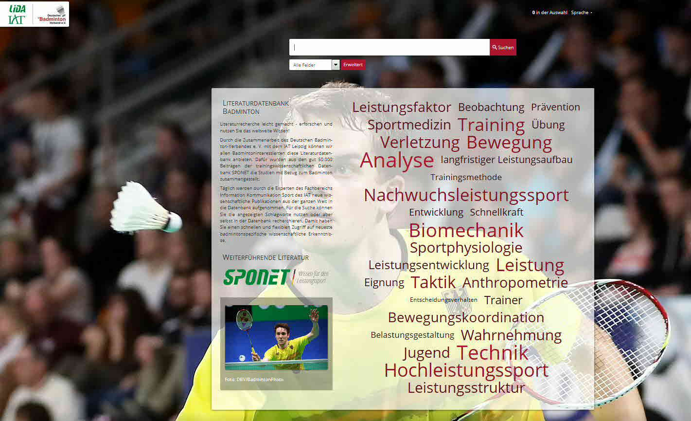 Durch die Zusammenarbeit des Deutschen Badminton-Verbandes e. V. mit dem IAT Leipzig können wir allen Badmintoninteressierten diese Literaturdatenbank anbieten. Dafür wurden aus den gut 50.000 Beiträgen der trainingswissenschaftlichen Datenbank SPONET die Studien mit Bezug zum Badminton zusammengestellt.