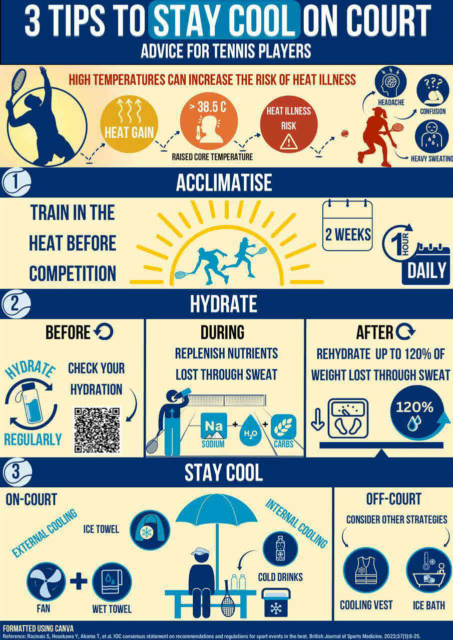 Exercising in high temperatures can lead to unsustainable heat generation and increased risk of exertional heat illness (EHI),1 including heat exhaustion (core temperature (Tc) between 38.5°C and 40°C) and heat stroke (Tc > 40°C). Despite warnings from the International Olympic Committee (IOC) about rising temperatures due to global warming, evidence-based mitigation strategies in sports remain insufficient. This infographic for tennis players performing at high intensity in extreme heat highlights how to recognise and protect against EHI.
