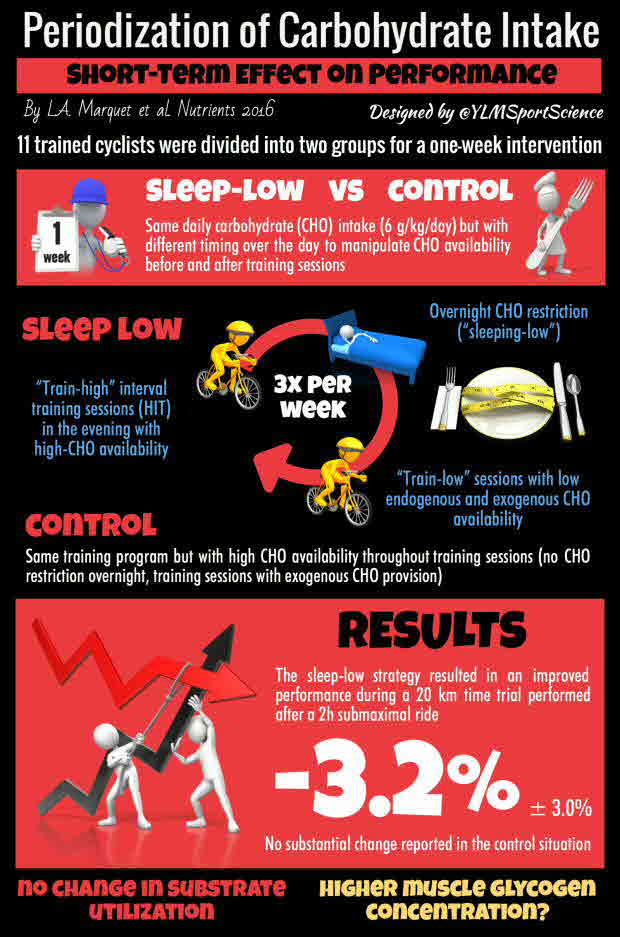 Background: "Sleep-low" consists of a sequential periodization of carbohydrate (CHO) availability—low glycogen recovery after "train high" glycogen-depleting interval training, followed by an overnight-fast and light intensity training ("train low") the following day. This strategy leads to an upregulation of several exercise-responsive signaling proteins, but the chronic effect on performance has received less attention. We investigated the effects of short-term exposure to this strategy on endurance performance. Methods: Following training familiarization, 11 trained cyclists were divided into two groups for a one-week intervention—one group implemented three cycles of periodized CHO intake to achieve the sleep-low strategy over six training sessions (SL, CHO intake: 6 g·kg-1·day-1), whereas the control group consumed an even distribution of CHO over the day (CON). Tests were a 2 h submaximal ride and a 20 km time trial. Results: SL improved their performance (mean: +3.2%; p < 0.05) compared to CON. The improvement was associated with a change in pacing strategy with higher power output during the second part of the test. No change in substrate utilization was observed after the training period for either group. Conclusion: Implementing the "sleep-low" strategy for one week improved performance by the same magnitude previously seen in a three-week intervention, without any significant changes in selected markers of metabolism.