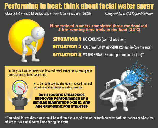 (Die Laufleistung bei Hitze wird durch Kaltwasseranwendung vor der Belastung in gleichem Maße verbessert wie durch Wassersprayanwendung auf den Faszien während der Belastung)