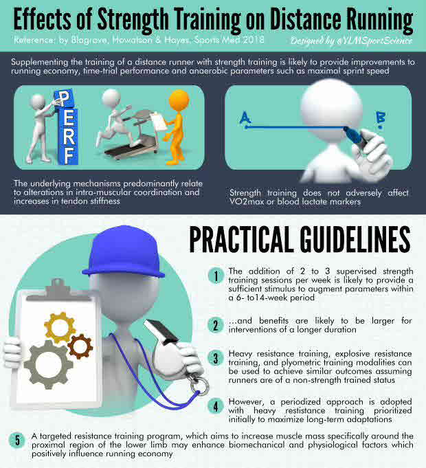 Conclusion: Whilst there was good evidence that ST improves RE, TT, and sprint performance, this was not a consistent finding across all works that were reviewed. Several important methodological differences and limita tions are highlighted, which may explain the discrepancies in findings and should be considered in future investigations in this area. Importantly for the distance runner, measures relating to body composition are not negatively impacted by a ST intervention. The addition of two to three ST sessions per week, which include a variety of ST modalities are likely to provide benefits to the performance of middle- and long-distance runners.