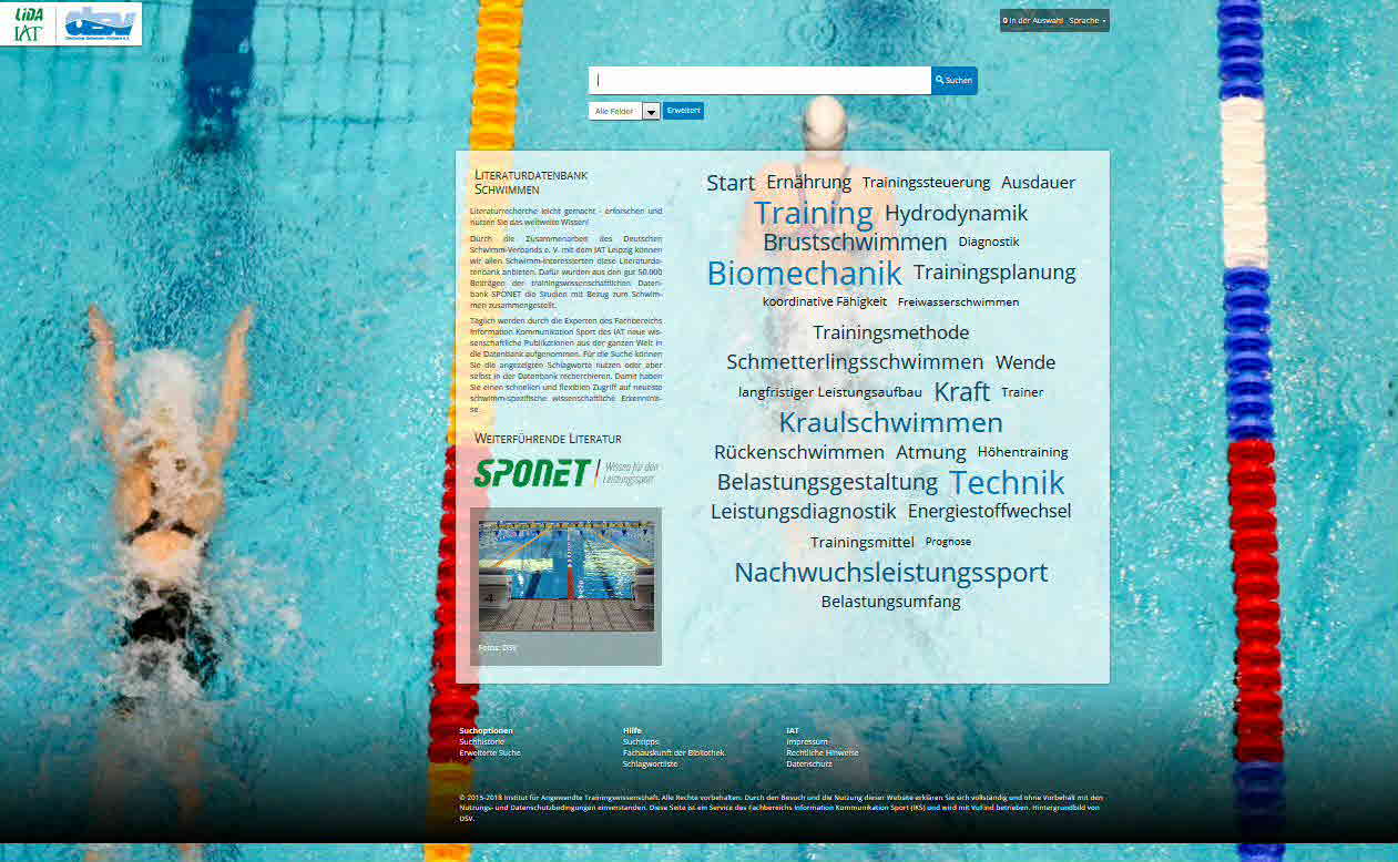 Täglich werden durch die Experten des Fachbereichs Information Kommunikation Sport des IAT neue wissenschaftliche Publikationen aus der ganzen Welt in die Datenbank aufgenommen. Für die Suche können Sie die angezeigten Schlagworte nutzen oder aber selbst in der Datenbank recherchieren. Damit haben Sie einen schnellen und flexiblen Zugriff auf neueste schwimmspezifische wissenschaftliche Erkenntnisse.
