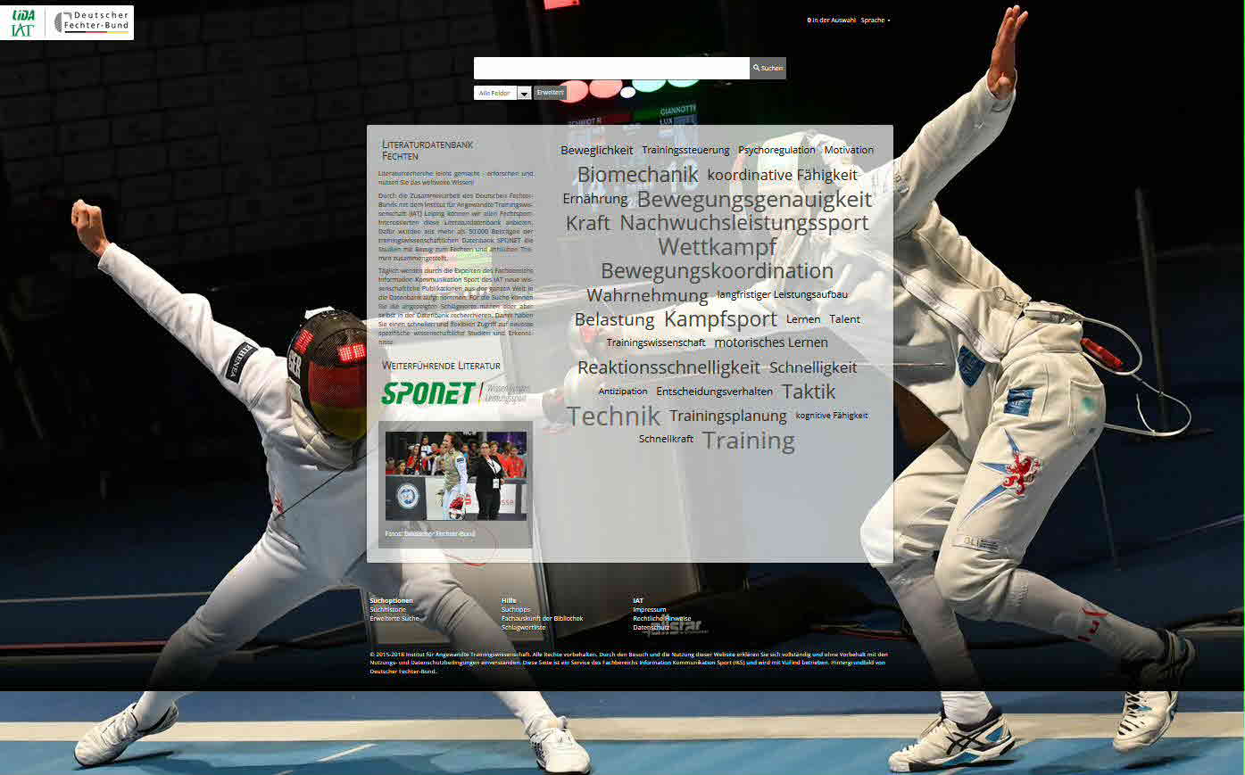 Durch die Zusammenarbeit des Deutschen Fechter-Bunds mit dem Institut für Angewandte Trainingswissenschaft (IAT) Leipzig können wir allen Fechtsport-Interessierten diese Literaturdatenbank anbieten. Dafür wurden aus mehr als 50.000 Beiträgen der trainingswissenschaftlichen Datenbank SPONET die Studien mit Bezug zum Fechten und ähnlichen Themen zusammengestellt.