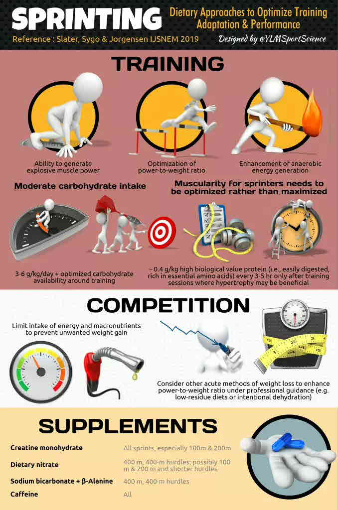 Although sprint athletes are assumed to primarily be interested in promoting muscle hypertrophy, it is the ability to generate explosive muscle power, optimization of power-to-weight ratio, and enhancement of anaerobic energy generation that are key outcomes of sprint training. This reflects the physique of track sprinters, being characterized as ecto-mesomorphs. Although there is little contemporary data on sprinters dietary habits, given their moderate energy requirements relative to body mass, a carbohydrate intake within the range of 3-6 g kg-1day-1 appears reasonable, while ensuring carbohydrate availability is optimized around training. Similarly, although protein needs may be twice general population recommendations, sprint athletes should consume meals containing ~0.4 g/kg high biological value protein (i.e., easily digested, rich in essential amino acids) every 3-5 hr. Despite the short duration of competitions and relative long-recovery periods between races, nutrition still plays an important role in sprint performance. As energy expenditure moderates during competition, so too should intake of energy and macronutrients to prevent unwanted weight gain. Further adjustments in macronutrient intake may be warranted among athletes contemplating optimization of power-to-weight ratio through reductions in body fat prior to the competitive season. Other novel acute methods of weight loss have also been proposed to enhance power-to-weight ratio, but their implementation should only be considered under professional guidance. Given the metabolic demands of sprinting, a few supplements may be of benefit to athletes in training and/or competition. Their use in competition should be preceded with trialing in training to confirm tolerance and perceived ergogenic potential. Abstract from author
