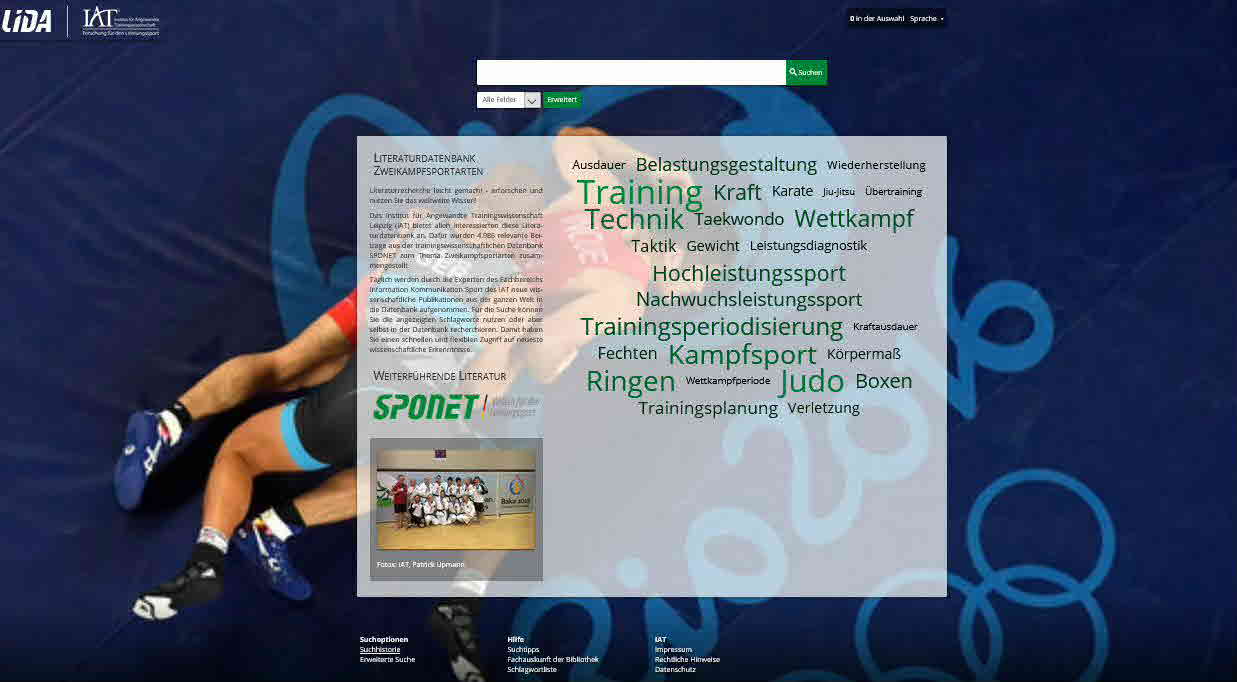 Literaturrecherche leicht gemacht - erforschen und nutzen Sie das weltweite Wissen! Das Institut für Angewandte Trainingswissenschaft Leipzig (IAT) bietet allen Interessierten diese Literaturdatenbank an. Dafür wurden 4.986 relevante Beiträge aus der trainingswissenschaftlichen Datenbank SPONET zum Thema Zweikampfsportarten zusammengestellt. Täglich werden durch die Experten des Fachbereichs Information Kommunikation Sport des IAT neue wissenschaftliche Publikationen aus der ganzen Welt in die Datenbank aufgenommen. Für die Suche können Sie die angezeigten Schlagworte nutzen oder aber selbst in der Datenbank recherchieren. Damit haben Sie einen schnellen und flexiblen Zugriff auf neueste wissenschaftliche Erkenntnisse.