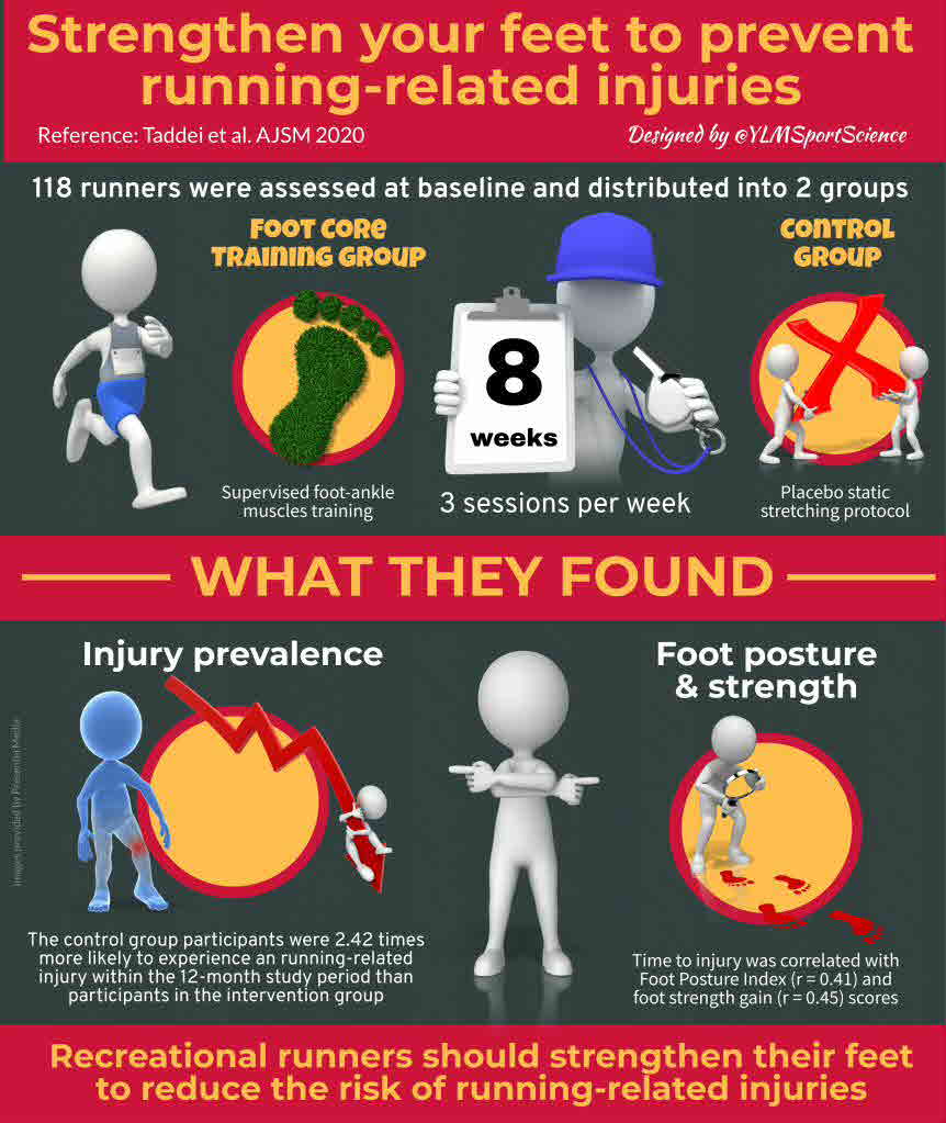 Purpose: To investigate the efficacy of a novel foot core strengthening protocol based on a ground-up approach to reduce the incidence of RRIs in recreational long-distance runners over the course of a 1-year follow-up.