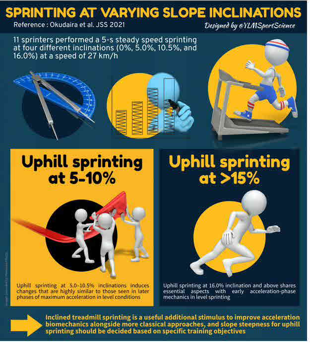 Uphill training is applied to induce specific overload on the musculoskeletal system to improve sprinting mechanics. This study aimed to identify unique kinematic features of uphill sprinting at different slopes and to suggest practical implications based on comparisons we early stance phase. At take-off, steeper slopes induced significantly more extended joint angles and higher ROMs during the late stance phase. Compared with moderate slopes, more anti-phase coordination patterns were detected at steeper slopes. Thus, uphill sprinting at steeper slopes shares essential kinematic features with the early acceleration phase of level sprinting. Moderate inclinations induce biomechanical adaptations similar to those in the late acceleration phase of level sprinting. Hence, the specific transfer of uphill sprinting to acceleration depends on the slope inclinations.