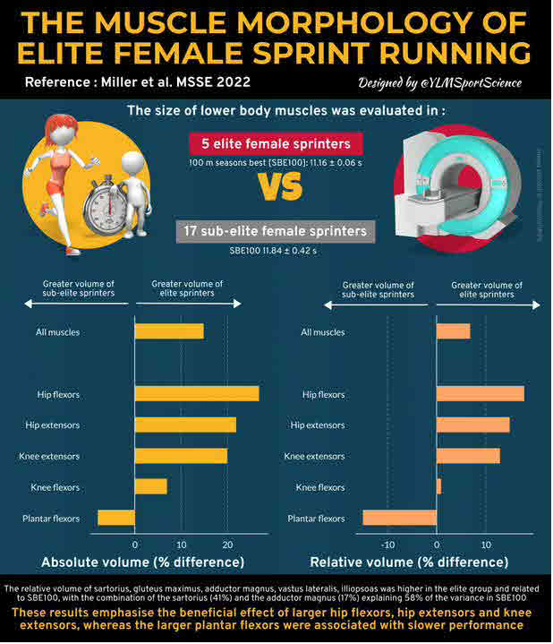 Five elite (100 m seasons best [SBE100], 11.16 ± 0.06 s) and 17 subelite (SBE100, 11.84 ± 0.42 s) female sprinters underwent: 3T magnetic resonance imaging to determine the volume of 23 individual leg muscles/compartments and five functional muscle groups; countermovement jump and 30 m acceleration tests.