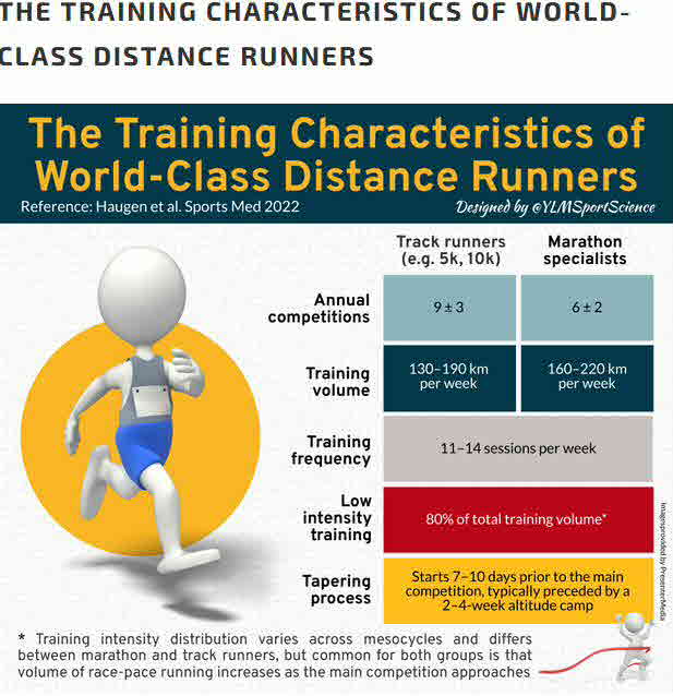 In this review we integrate the scientific literature and results-proven practice and outline a novel framework for understanding the training and development of elite long-distance performance. Herein, we describe how fundamental training characteristics and well-known training principles are applied. World-leading track runners (i.e., 5000 and 10,000m) and marathon specialists participate in 9 ± 3 and 6 ± 2 (mean ± SD) annual competitions, respectively. The weekly running distance in the mid-preparation period is in the range 160-220km for marathoners and 130-190km for track runners. These differences are mainly explained by more running kilometers on each session for marathon runners. Both groups perform 11-14 sessions per week, and = 80% of the total running volume is performed at low intensity throughout the training year. The training intensity distribution vary across mesocycles and differ between marathon and track runners, but common for both groups is that volume of race-pace running increases as the main competition approaches. The tapering process starts 7-10days prior to the main competition. While the African runners live and train at high altitude (2000-2500m above sea level) most of the year, most lowland athletes apply relatively long altitude camps during the preparation period. Overall, this review offers unique insights into the training characteristics of world-class distance runners by integrating scientific literature and results-proven practice, providing a point of departure for future studies related to the training and development in the Olympic long-distance events. Key Points This review bridges the gap between science and results-proven practice regarding how training principles and training methods should be applied for the Olympic long-distance events and identified clear distinctions in training organization between track runners and marathon specialists The weekly running distance is in the range 160-220km for marathoners and 130-190km for track runners, with both groups performing 11-14 sessions per week, and = 80% of the total running volume at low intensity Training intensity distribution varies across mesocycles and differs between marathon and track runners, but common for both groups is that volume of race-pace running increases as the main competition approaches