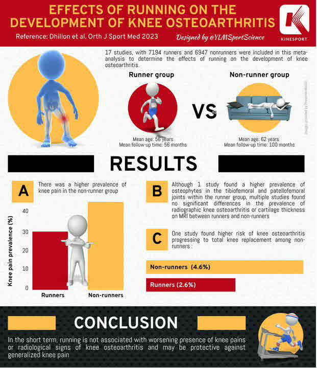 Background: Some studies have suggested that running increases the risk of knee osteoarthritis (OA), while others believe it serves a protective function. Purpose: To perform an updated systematic review of the literature to determine the effects of running on the development of knee OA. Study Design: Systematic review; Level of evidence, 4. Methods: A systematic review was performed by searching the PubMed, Cochrane Library, and Embase databases to identify studies evaluating the effect of cumulative running on the development of knee OA or chondral damage based on imaging and/or patient-reported outcomes (PROs). The search terms used were "knee AND osteoarthritis AND (run OR running OR runner)." Patients were evaluated based on plain radiographs, magnetic resonance imaging (MRI), and PROs (presence of knee pain, Health Assessment Questionnaire-Disability Index, and the Knee injury and Osteoarthritis Outcome Score). Results: Seventeen studies (6 level 2 studies, 9 level 3 studies, and 2 level 4 studies), with 7194 runners and 6947 nonrunners, met the inclusion criteria. The mean follow-up time was 55.8 months in the runner group and 99.7 months in the nonrunner group. The mean age was 56.2 years in the runner group and 61.6 years in the nonrunner group. The overall percentage of men was 58.5%. There was a significantly higher prevalence of knee pain in the nonrunner group (P < .0001). Although 1 study found a significantly higher prevalence of osteophytes in the tibiofemoral (TF) and patellofemoral (PF) joints within the runner group, multiple studies found no significant differences in the prevalence of radiographic knee OA (based on TF/PF joint-space narrowing or Kellgren-Lawrence grade) or cartilage thickness on MRI between runners and nonrunners (P > .05). One study found a significantly higher risk of knee OA progressing to total knee replacement among nonrunners (4.6% vs 2.6%; P = .014). Conclusion: In the short term, running is not associated with worsening PROs or radiological signs of knee OA and may be protective against generalized knee pain.