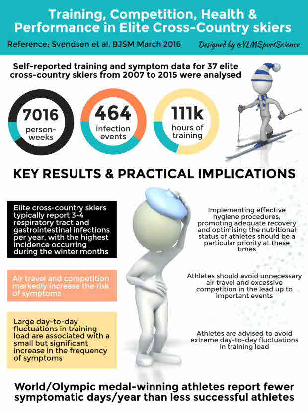 Conclusions Air travel and competition are major risk factors for acute respiratory tract and gastrointestinal symptoms in this population. Athletes who have large fluctuations in training load experience such symptoms more frequently. Shorter duration of symptoms appears to be associated with success in cross-country skiing. Abstract from author