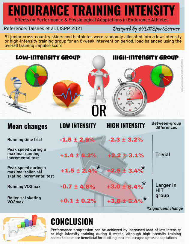 Purpose: To compare the effects of increased load of low- versus high-intensity endurance training on performance and physiological adaptations in well-trained endurance athletes. Methods: Following an 8-week preintervention period, 51 (36 men and 15 women) junior cross-country skiers and biathletes were randomly allocated into a low-intensity (LIG, n = 26) or high-intensity training group (HIG, n = 25) for an 8-week intervention period, load balanced using the overall training impulse score. Both groups performed an uphill running time trial and were assessed for laboratory performance and physiological profiling in treadmill running and roller-ski skating preintervention and postintervention. Results: Preintervention to postintervention changes in running time trial did not differ between groups (P = .44), with significant improvements in HIG (-2.3% [3.2%], P = .01) but not in LIG (-1.5% [2.9%], P = .20). There were no differences between groups in peak speed changes when incremental running and roller-ski skating to exhaustion (P = .30 and P = .20, respectively), with both modes being significantly improved in HIG (2.2% [3.1%] and 2.5% [3.4%], both P < .01) and in roller-ski skating for LIG (1.5% [2.4%], P < .01). There was a between-group difference in running maximal oxygen uptake changes (P = .04), tending to improve in HIG (3.0% [6.4%], P = .09) but not in LIG (-0.7% [4.6%], P = .25). Changes in roller-ski skating peak oxygen uptake differed between groups (P = .02), with significant improvements in HIG (3.6% [5.4%], P = .01) but not in LIG (-0.1% [0.17%], P = .62). Conclusion: There was no significant difference in performance adaptations between increased load of low- versus high-intensity training in well-trained endurance athletes, although both methods improved performance. However, increased load of high-intensity training elicited better maximal oxygen uptake adaptations compared to increased load of low-intensity training.