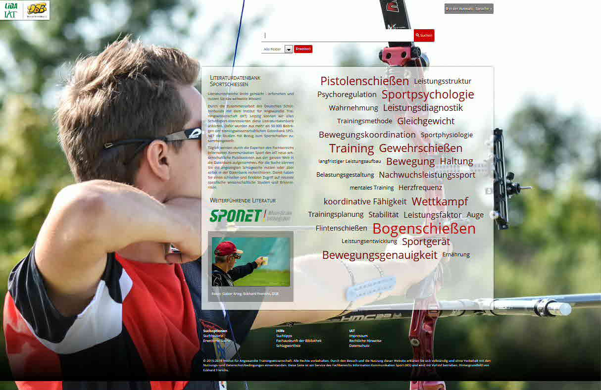 Literaturrecherche leicht gemacht - das weltweite Wissen erforschen und nutzen! Durch die Zusammenarbeit des Deutschen Schützenbunds mit dem IAT Leipzig können wir allen Interessierten am Pistolen-, Gewehr-, Flinten- und Bogenschießen diese Literaturdatenbank anbieten. Dafür wurden aus den gut 52.000 Beiträgen der trainingswissenschaftlichen Datenbank SPONET die Studien mit Bezug zum Sport- und Bogenschießen zusammengestellt. Täglich werden durch die Experten des Fachbereichs Information Kommunikation Sport des IAT neue wissenschaftliche Publikationen aus der ganzen Welt in die Datenbank aufgenommen. Für die Suche können Sie die angezeigten Schlagworte nutzen oder aber selbst in der Datenbank recherchieren. Damit haben Sie einen schnellen und flexiblen Zugriff auf neueste wissenschaftliche Erkenntnisse.