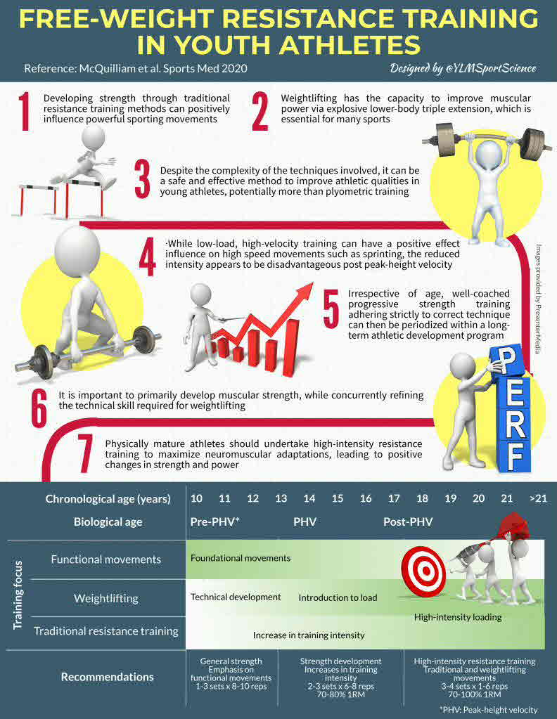 Generating high levels of muscular strength and power are important for success in sport and may have long-term implications for sporting careers in youth athletes. Importantly, maturation may confound the neuromuscular adaptations to resistance training when attempting to differentiate between training- vs. growth-induced strength and power gains; thus, potentially leading to erroneous conclusions regarding the efficacy of resistance training in youth athletes. The aim of this review was to critically appraise the literature concerning the efficacy of externally loaded free-weight resistance training on strength and power measures in youth athletes at different stages of maturity. Strength underpins power production; thus, developing strength through traditional resistance training methods can positively influence powerful sporting movements. In addition, weightlifting has the capacity to improve muscular power via explosive lower-body triple extension, which is essential for many sports. Despite the complexity of the techniques involved, it can be a safe and effective method to improve athletic qualities in young athletes, potentially more so than plyometric training. While low-load, high-velocity training can have a positive effect influence on high speed movements such as sprinting, the reduced intensity appears to be disadvantageous post peak-height velocity. Irrespective of age, well-coached progressive strength training adhering strictly to correct technique can then be periodised within a long-term athletic development program. It is important to primarily develop muscular strength, while concurrently refining the technical skill required for weightlifting. Physically mature athletes should undertake high-intensity resistance training to maximise neuromuscular adaptations, leading to positive changes in strength and power.