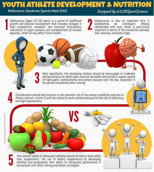 Adolescence (ages 13-18 years) is a period of significant growth and physical development that includes changes in body composition, metabolic and hormonal fluctuations, maturation of organ systems, and establishment of nutrient deposits, which all may affect future health. In terms of nutrition, adolescence is also an important time in establishing an individual`s lifelong relationship with food, which is particularly important in terms of the connection between diet, exercise, and body image. The challenges of time management (e.g., school, training, work and social commitments) and periods of fluctuating emotions are also features of this period. In addition, an adolescent`s peers become increasingly powerful moderators of all behaviours, including eating. Adolescence is also a period of natural experimentation and this can extend to food choice. Adolescent experiences are not the same and individuals vary considerably in their behaviours. To ensure an adolescent athlete fulfils his/her potential, it is important that stakeholders involved in managing youth athletes emphasize eating patterns that align with and support sound physical, physiological and psychosocial development and are consistent with proven principles of sport nutrition.