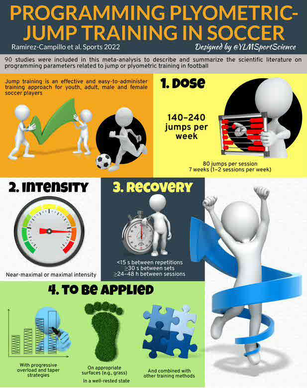 The aim of this review was to describe and summarize the scientific literature on programming parameters related to jump or plyometric training in male and female soccer players of different ages and fitness levels. A literature search was conducted in the electronic databases PubMed, Web of Science and Scopus using keywords related to the main topic of this study (e.g., "ballistic" and "plyometric"). According to the PICOS framework, the population for the review was restricted to soccer players, involved in jump or plyometric training. Among 7556 identified studies, 90 were eligible for inclusion. Only 12 studies were found for females. Most studies (n = 52) were conducted with youth male players. Moreover, only 35 studies determined the effectiveness of a given jump training programming factor. Based on the limited available research, it seems that a dose of 7 weeks (1-2 sessions per week), with ~80 jumps (specific of combined types) per session, using near-maximal or maximal intensity, with adequate recovery between repetitions (<15 s), sets (=30 s) and sessions (=24-48 h), using progressive overload and taper strategies, using appropriate surfaces (e.g., grass), and applied in a well-rested state, when combined with other training methods, would increase the outcome of effective and safe plyometric-jump training interventions aimed at improving soccer players physical fitness. In conclusion, jump training is an effective and easy-to-administer training approach for youth, adult, male and female soccer players. However, optimal programming for plyometric-jump training in soccer is yet to be determined in future research.