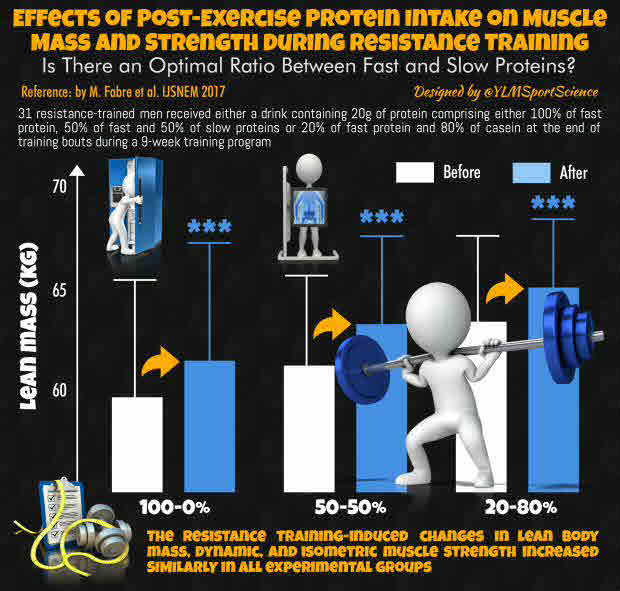 Effects of postexercise protein intake on muscle mass and strength during resistance training: Is there an optimal ratio between fast and slow proteins?