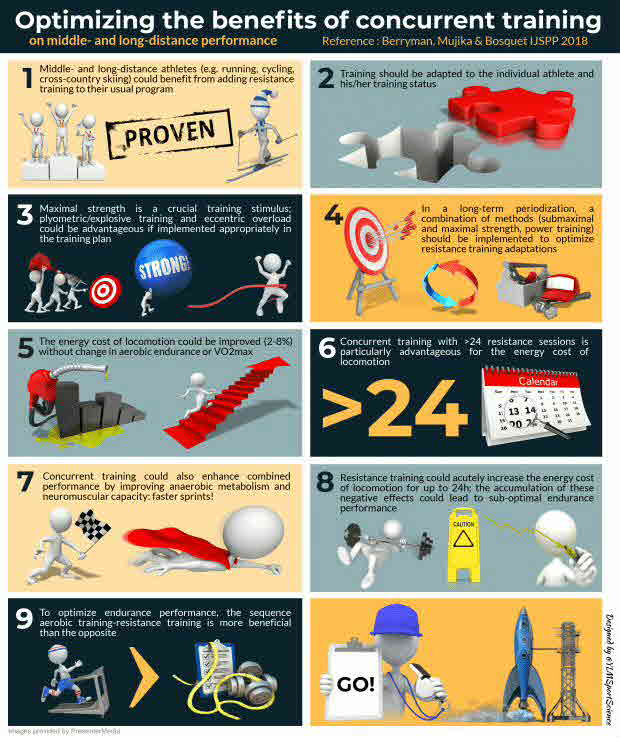The classical work by Robert C. Hickson showed in 1980 that the addition of a resistance training protocol to a predominantly aerobic program could lead to impaired leg strength adaptations in comparison to a resistance-only training regimen. This interference phenomenon was later highlighted in many reports, including a meta-analysis. However, it seems that the interference effect has not been consistently reported, probably because of the complex interactions between training variables and methodological issues. On the other side of the medal, Dr Hickson and colleagues subsequently (1986) reported that a strength training mesocycle could be beneficial for endurance performance in running and cycling. In recent meta-analyses and review articles, it was demonstrated that such a training strategy could improve middle- and long-distance performance in many disciplines (running, cycling, cross-country skiing and swimming). Interestingly, it appears that improvements in the energy cost of locomotion could be associated with these performance enhancements. Despite these benefits, it was also reported that strength training could represent a detrimental stimulus for endurance performance if an inappropriate training plan has been prepared. Taken together, these observations suggest that coaches and athletes should be careful when concurrent training seems imperative in order to meet the complex physiological requirements of their sport. Therefore, this brief review will present a practical appraisal of concurrent training for sports performance. In addition, recommendations will be provided so that practitioners could adapt their interventions based on the training objectives. Abstract from author
