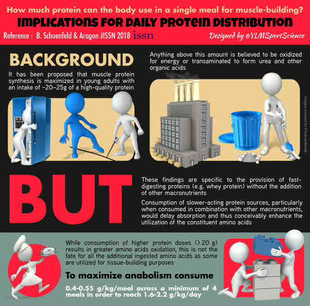 Controversy exists about the maximum amount of protein that can be utilized for lean tissue-building purposes in a single meal for those involved in regimented resistance training. It has been proposed that muscle protein synthesis is maximized in young adults with an intake of ~ 20-25 g of a high-quality protein; anything above this amount is believed to be oxidized for energy or transaminated to form urea and other organic acids. However, these findings are specific to the provision of fast-digesting proteins without the addition of other macronutrients. Consumption of slower-acting protein sources, particularly when consumed in combination with other macronutrients, would delay absorption and thus conceivably enhance the utilization of the constituent amino acids. The purpose of this paper was twofold: 1) to objectively review the literature in an effort to determine an upper anabolic threshold for per-meal protein intake; 2) draw relevant conclusions based on the current data so as to elucidate guidelines for per-meal daily protein distribution to optimize lean tissue accretion. Both acute and long-term studies on the topic were evaluated and their findings placed into context with respect to per-meal utilization of protein and the associated implications to distribution of protein feedings across the course of a day. The preponderance of data indicate that while consumption of higher protein doses (> 20 g) results in greater AA oxidation, this is not the fate for all the additional ingested AAs as some are utilized for tissue-building purposes. Based on the current evidence, we conclude that to maximize anabolism one should consume protein at a target intake of 0.4 g/kg/meal across a minimum of four meals in order to reach a minimum of 1.6 g/kg/day. Using the upper daily intake of 2.2 g/kg/day reported in the literature spread out over the same four meals would necessitate a maximum of 0.55 g/kg/meal. Abstract from author