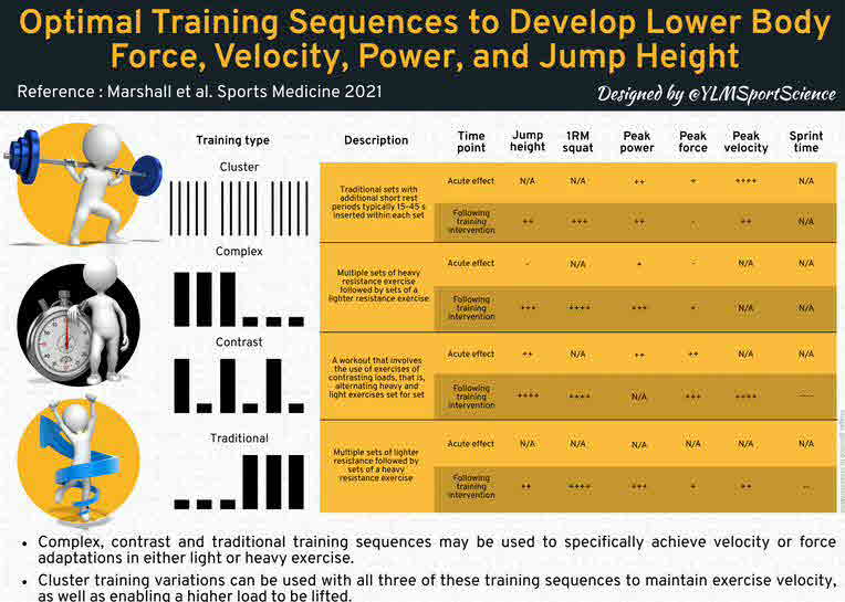 Conclusion: When looking to develop exercise-specific force, the exercise should be completed closer to set failure with fewer repetitions still able to be completed, which can be achieved using complex or high-volume contrast training to pre-fatigue the lighter exercise. When the objective is to improve velocity for the target exercise, it can be combined with a heavier contrast pair to create a postactivation performance enhancing effect. Alternatively, cluster set designs can be used to maintain high velocities and reduce drop-off. Finally, traditional training is most effective for increasing squat 1-repetition maximum.
