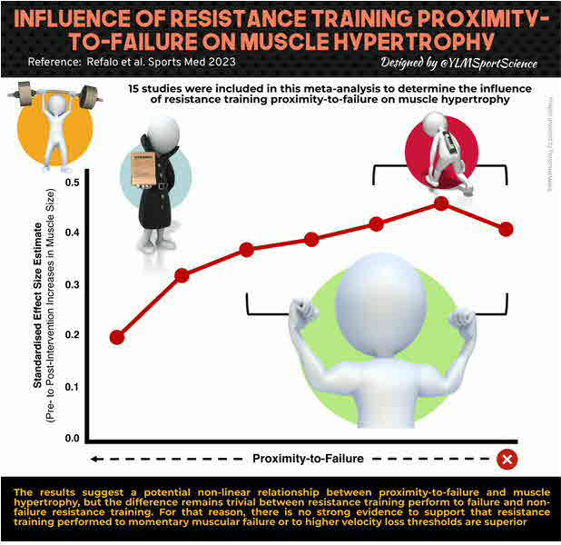 Conclusion: Overall, our main findings suggest that (i) there is no evidence to support that resistance training performed to momentary muscular failure is superior to non-failure resistance training for muscle hypertrophy and (ii) higher velocity loss thresholds, and theoretically closer proximities-to-failure do not always elicit greater muscle hypertrophy. As such, these results provide evidence for a potential non-linear relationship between proximity-to-failure and muscle hypertrophy.
