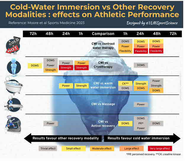 This systematic review with meta-analysis and meta-regression compared the effects of cold-water immersion (CWI) against other common recovery modalities on recovery of athletic performance, perceptual outcomes, and creatine kinase (CK) following acute strenuous exercise in physically active populations.
