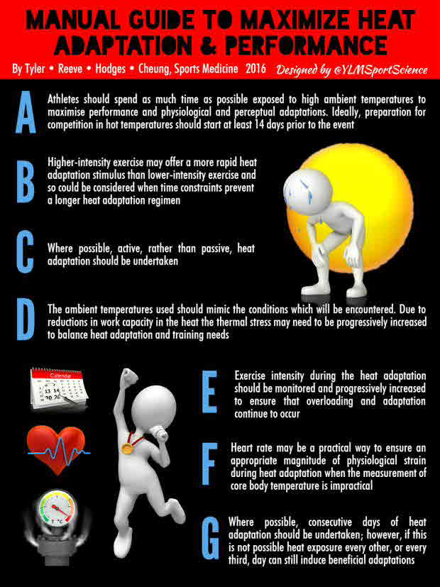 Exercise performance and capacity are impaired in hot, compared to temperate, conditions. Heat adaptation (HA) is one intervention commonly adopted to reduce this impairment because it may induce beneficial exercise performance and physiological and perceptual adaptations. A number of investigations have been conducted on HA but, due to large methodological differences, the effectiveness of different HA regimens remain unclear. Objectives: (1) To quantify the effect of different HA regimens on exercise performance and the physiological and perceptual responses to subsequent heat exposure. (2) To offer practical HA recommendations and suggestions for future HA research based upon a systematic and quantitative synthesis of the literature. Data Source PubMed was searched for original research articles published up to, and including, 16 February 2016 using appropriate first- and second-order search terms. Study Selection English-language, peer-reviewed, full-text original articles using human participants were reviewed using the four-stage process identified in the PRISMA statement. Data Extraction Data for the following variables were obtained from the manuscripts by at least two of the authors: participant sex, maximal oxygen consumption and age; HA duration, frequency, modality, temperature and humidity; exercise performance and capacity; core and skin temperature; heart rate, stroke volume, cardiac output, skin blood flow, sweat onset temperature, body mass loss, sweat rate, perception of thirst, volitional fluid consumption, plasma volume changes; sweat concentrations of sodium, chloride and potassium; aldosterone, arginine vasopressin, heat shock proteins (Hsp), ratings of perceived exertion (RPE) and thermal sensation. Data Grouping Data were divided into three groups based upon the frequency of the HA regimen. Performance and capacity data were also divided into groups based upon the type of HA used. Data Analyses: Hedges` g effect sizes and 95 % confidence intervals were calculated. Correlations were run where appropriate. Results: Ninety-six articles were reviewed. The most common duration was 7-14 days and the most common method of HA was the controlled work-rate approach. HA had a moderately beneficial effect on exercise capacity and performance in the heat irrespective of regimen; however, longer regimens were more effective than shorter approaches. HA had a moderate-to-large beneficial effect on lowering core body temperature before and during exercise, maintaining cardiovascular stability, and improving heat-loss pathways. Data are limited but HA may reduce oxygen consumption during subsequent exercise, improve glycogen sparing, increase the power output at lactate threshold, reduce lactate concentrations during exercise, have a trivial effect on increasing extracellular concentrations of Hsp, and improve perceived ratings of exertion and thermal sensation. Conclusion: HA regimens lasting <14 days induce many beneficial physiological and perceptual adaptations to high ambient temperatures, and improve subsequent exercise performance and capacity in the heat; however, the extent of the adaptations is greatest when HA regimens lasting longer than 14 days are adopted. Large methodological differences in the HA literature mean that there is still uncertainty regarding the magnitude and time course of potential adaptation for a number of physiological and perceptual variables.