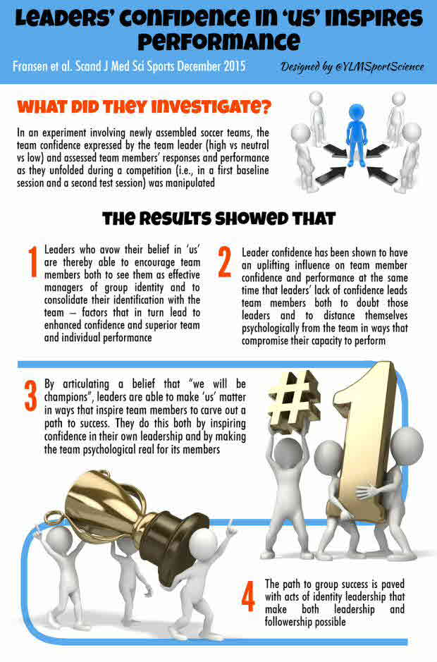 The present research examines the impact of leaders' confidence in their team on the team confidence and performance of their teammates. In an experiment involving newly assembled soccer teams, we manipulated the team confidence expressed by the team leader (high vs neutral vs low) and assessed team members' responses and performance as they unfolded during a competition (i.e., in a first baseline session and a second test session). Our findings pointed to team confidence contagion such that when the leader had expressed high (rather than neutral or low) team confidence, team members perceived their team to be more efficacious and were more confident in the team's ability to win. Moreover, leaders' team confidence affected individual and team performance such that teams led by a highly confident leader performed better than those led by a less confident leader. Finally, the results supported a hypothesized mediational model in showing that the effect of leaders' confidence on team members' team confidence and performance was mediated by the leader's perceived identity leadership and members' team identification. In conclusion, the findings of this experiment suggest that leaders' team confidence can enhance members' team confidence and performance by fostering members' identification with the team.
