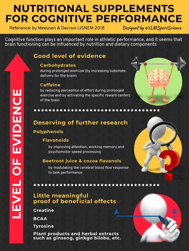 Cognitive function plays an important role in athletic performance, and it seems that brain functioning can be influenced by nutrition and dietary components. Thus, the central nervous system might be manipulated through changes in diet or supplementation with specific nutrients including branched-chain amino acids, tyrosine, carbohydrates, and caffeine. Despite some evidence that branched-chained amino acids can influence ratings of perceived exertion and mental performance, several well-controlled studies have failed to demonstrate a positive effect on exercise performance. Evidence of an ergogenic benefit of tyrosine supplementation during prolonged exercise is limited. There is evidence that mild dehydration can impair cognitive performance and mood. The beneficial effect of carbohydrate supplementation during prolonged exercise could relate to increased substrate delivery for the brain, with numerous studies indicating that hypoglycemia affects brain function and cognitive performance. Caffeine can enhance performance and reduce perception of effort during prolonged exercise and will influence specific reward centers of the brain. Plant products and herbal extracts such as polyphenols, ginseng, ginkgo biloba, etc. are marketed as supplements to enhance performance. In several animal studies, positive effects of these products were shown, however the literature on their effects on sports performance is scarce. Polyphenols have the potential to protect neurons against injury induced by neurotoxins, suppress neuroinflammation, and to promote memory, learning, and cognitive function. In general, there remains a need for controlled randomized studies with a strong design, sufficient statistical power, and well-defined outcome measures before "claims" on its beneficial effects on brain functioning can be established. Abstract from author