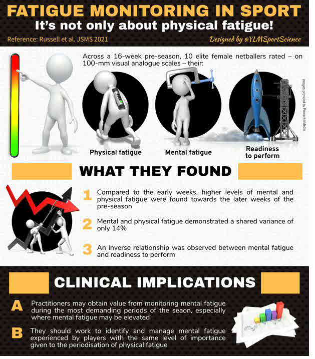 Results: Linear mixed model analyses revealed elevated (p < 0.05) ratings of mental fatigue for weeks 12, 14 and 15 v 1; 12, 14 and 15 v 4 and 14 v 7. Higher (p < 0.05) ratings of physical fatigue were reported on weeks 6, 10, 11 and 12-16 compared to week 4; and 10 and 13 compared to week 7. Moderate and large ES differences were found between multiple weeks. Mental and physical fatigue demonstrated a shared variance of 14.3% (r = 0.38, p < 0.001) and an inverse relationship was observed between mental fatigue and readiness to perform (r = 0.50; p < 0.001). Changes in sCort nor sAA were not related to changes in mental or physical fatigue.